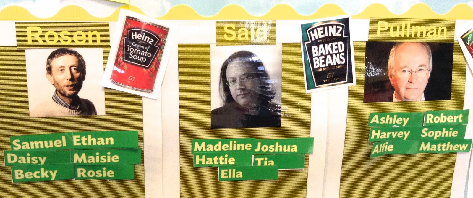 Ben has been reading Varjak Paw to his classes for many years now, so all the children in Years 6, 5, 4 and 3 already knew quite a bit about my books. It was amazing to see the work they'd been doing. They'd even made a reading wall, with reading groups named after authors – and my name was one of them! It was incredible to see it there between Michael Rosen and Philip Pullman, two of my own favourite authors.